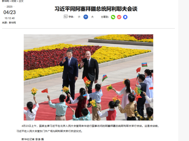 AZƏRTAC xəbər verir ki, Çinin milli xəbər agentliyi Sinxua, Çin Kommunist Partiyasının rəsmi nəşrlərindən olan “Jenmin Jibao” və “Global Times” qəzetləri, Çin Media Qrupuna daxil olan Çin Mərkəzi Televiziyası (CCTV), Çin Beynəlxalq Radiosu, CGTN telekanalı, habelə nüfuzlu “China Daily” qəzeti, digər qəzet və xəbər saytları Prezident İlham Əliyevin səfəri barədə bir neçə dildə çoxsaylı materiallar yayıb. Çin mediası Azərbaycan Respublikasının Prezidenti İlham Əliyev Çinin Sinxua agentliyinə məxsusi müsahibəsindən xəbərlər hazırlayaraq oxucularına təqdim edib.
